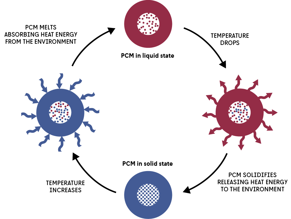I PCM (materiali reattivi microincapsulati a cambiamento di fase) possono passare da solido a liquido e viceversa, a seconda della temperatura circostante. Quando la temperatura sale, assorbono calore e passano da solido a liquido. Quando la temperatura scende, rilasciano calore e tornano a essere solidi.